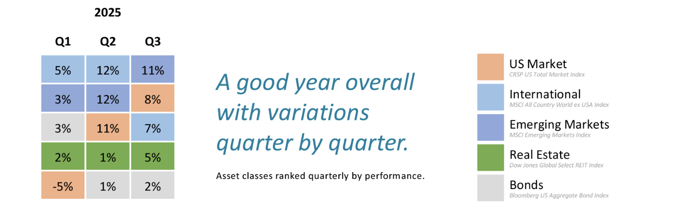 Through the end of the third quarter, every major asset class is showing not only positive returns, but above expected returns — US equities, international markets, emerging markets, real estate (REITs), and bonds. That kind of synchronized strength is rare. The benefit of diversification usually means that some asset classes perform better than expected and others perform below expectations, driving a smoother ride overall.